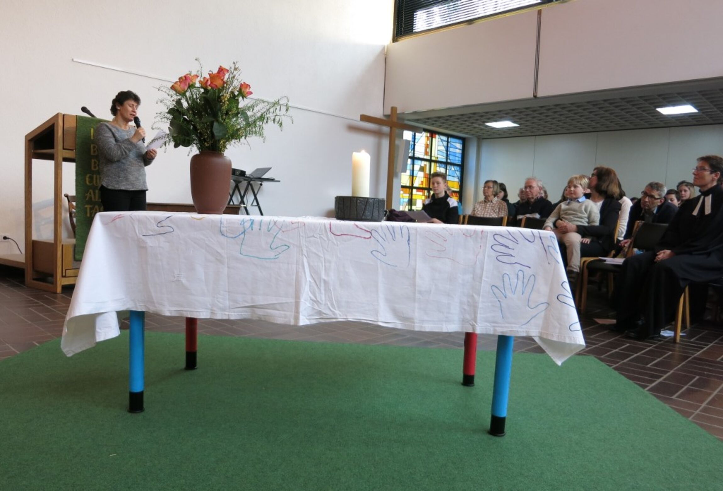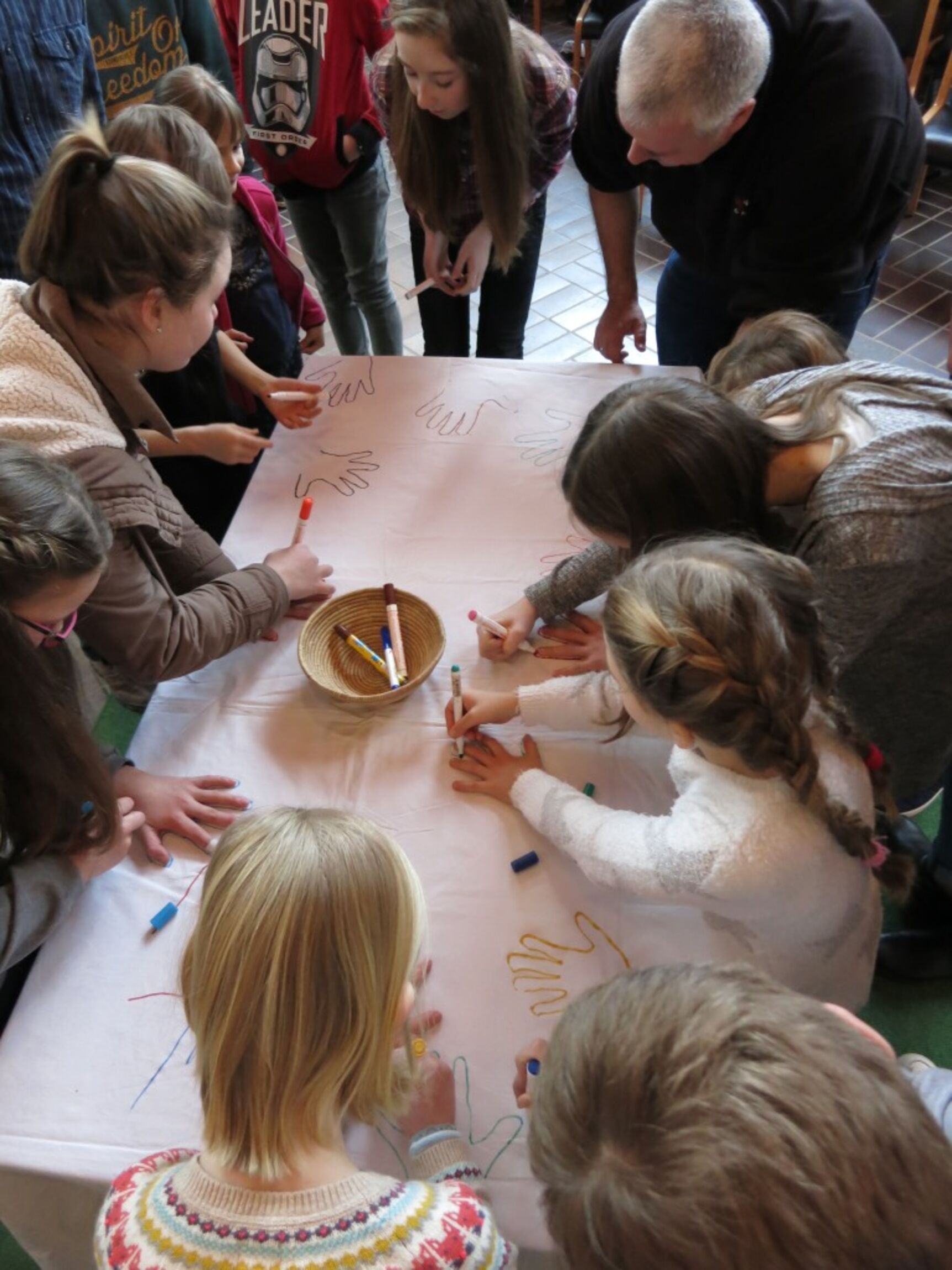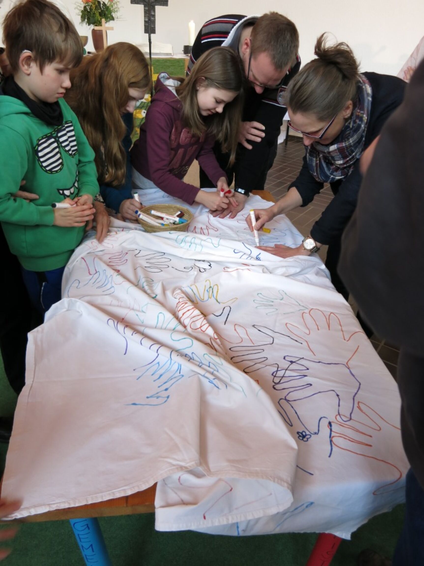 Es wurde ein großes Tischtuch gefertigt, auf dem jeder mit seinem Handabdruck ein Zeichen setzte. Dann feierten wir gemeinsam Abendmahl.