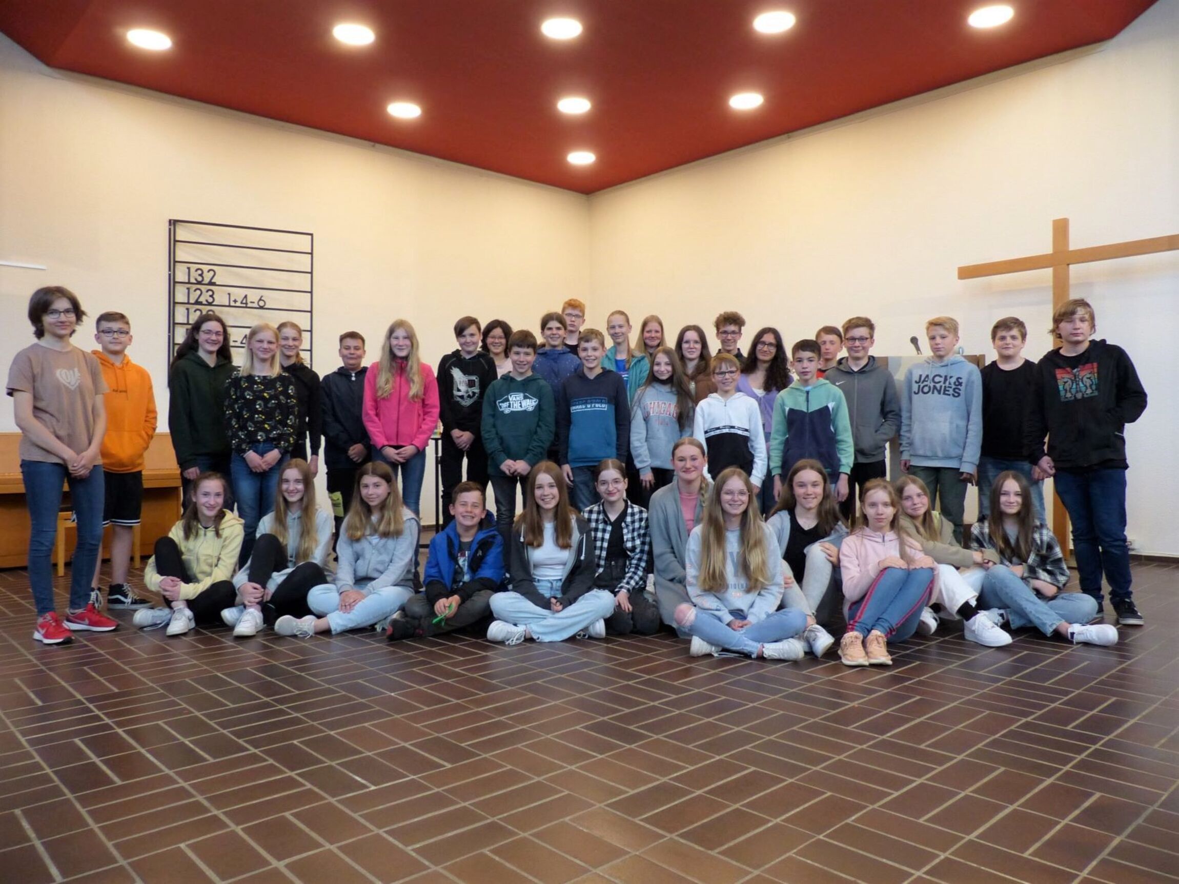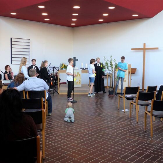 Im Begrüßungsgottesdienst haben die Konfirmandinnen und Konfirmanden einen Baum mit ihren Blättern behängt. Wie Blätter an einem Baum gehören die Konfirmandinnen und Konfirmanden nun als Gruppe zusammen und fragen und suchen gemeinsam nach Halt und Wurzeln.