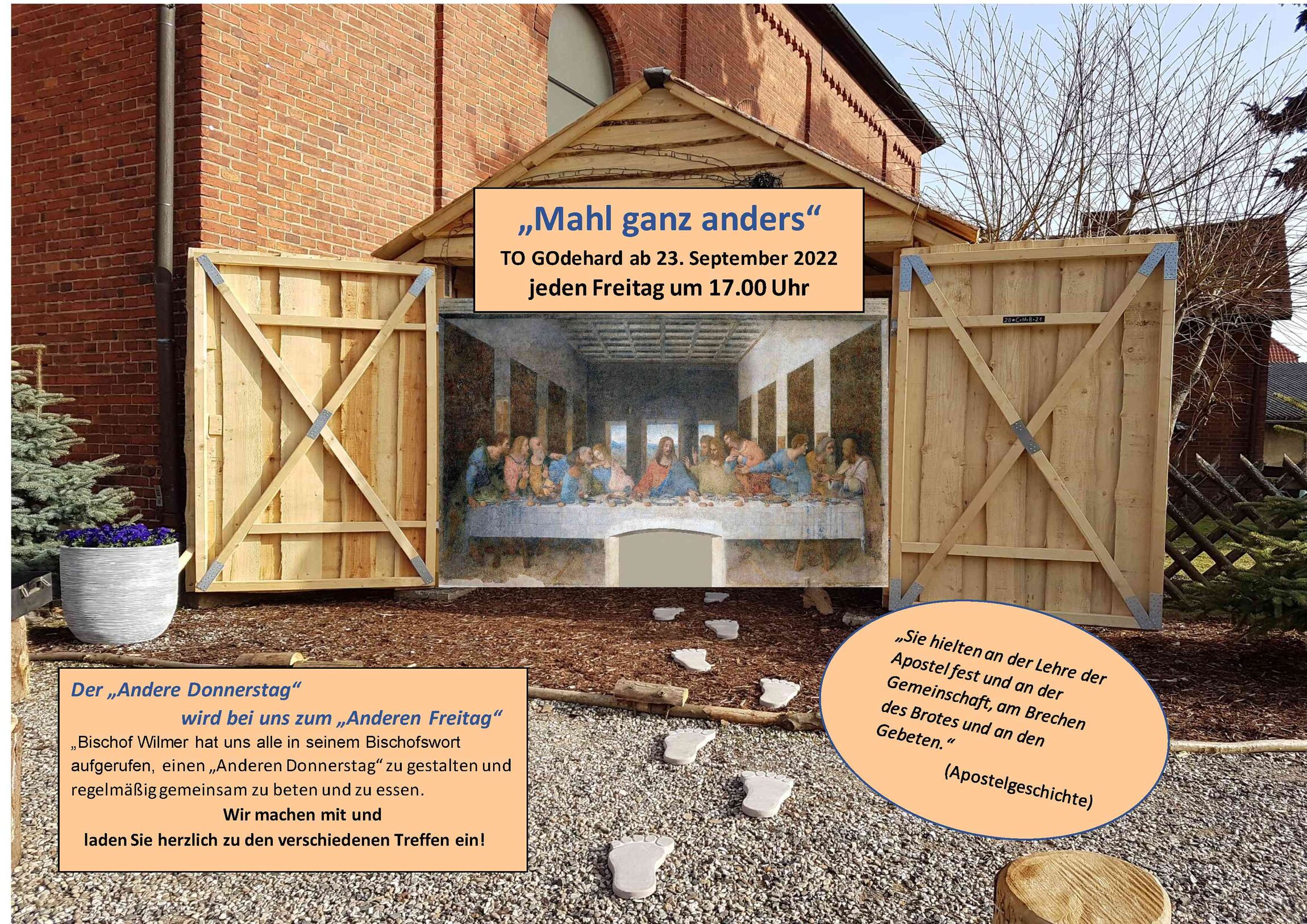 Wir laden ab 23. September 2022 jeden Freitag, um 17.00 Uhr zu einem „Mahl ganz anders“ an der alten Godehard Kirche in Ochtersum ein.