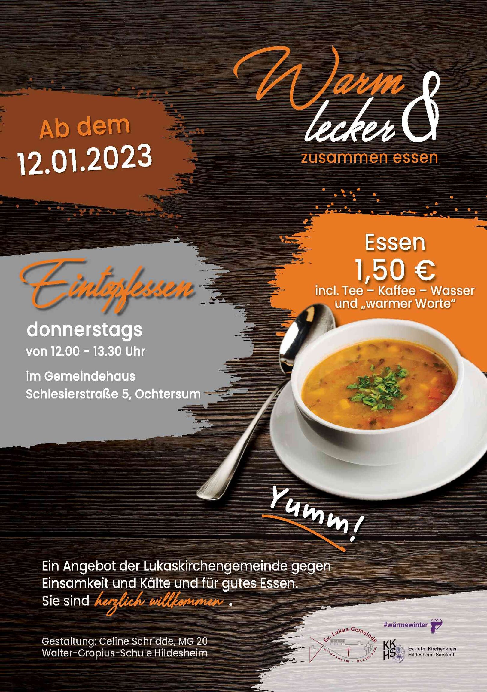 Wir setzen ein Zeichen gegen Einsamkeit und Kälte und für ein gutes gemeinsames Mittagessen. Zu dem Essen bieten wir im Anschluss Kekse, Tee, Kaffee und Wasser – alles für 1,50 Euro. Jeweils donnerstags im Café Luca des Gemeindehauses, Schlesierstraße 5, von 12.00 Uhr bis 13.00 Uhr. Sie sind herzlich willkommen.
