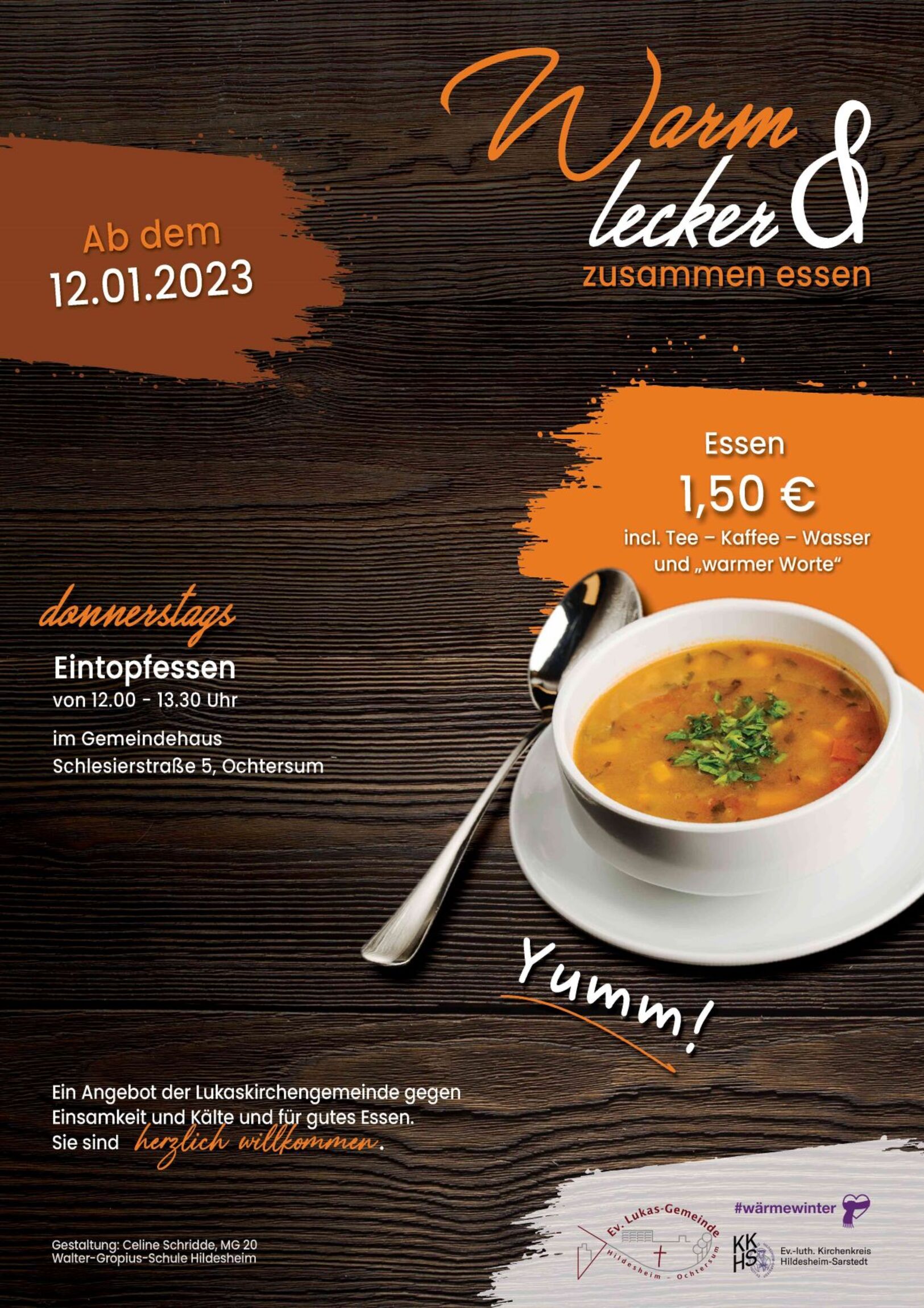 Dies ist ein neues Angebot unserer Kirchengemeinde für den Winter. Wir wollen ein Zeichen gegen Einsamkeit und Kälte setzen und für ein gutes gemeinsames Mittagessen. Jeweils donnerstags im Café Luca des Gemeindehauses, Schlesierstraße 5, von 12.00 Uhr bis 13.00 Uhr ab 12. Januar 2023.